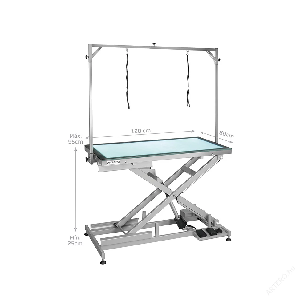 Esztétikus kivitelű, stabil kutyakozmetikai asztal, amelynek mérete ideálissá teszi szinte minden méretű kutya biztonságos nyírására. Az asztal egyedi különlegessége, hogy a csúszásmentes, áttetsző asztallap LED világítással rendelkezik. Így különlegesen jó, árnyékmentes, lágy fényű alsó megvilágítást is kap a munka során, az asztalon álló kutya. Sötét és fekete szőrű kutyák ollóval vagy géppel történő nyírásakor ez óriási előnyt jelent a hagyományos megvilágítással szemben.