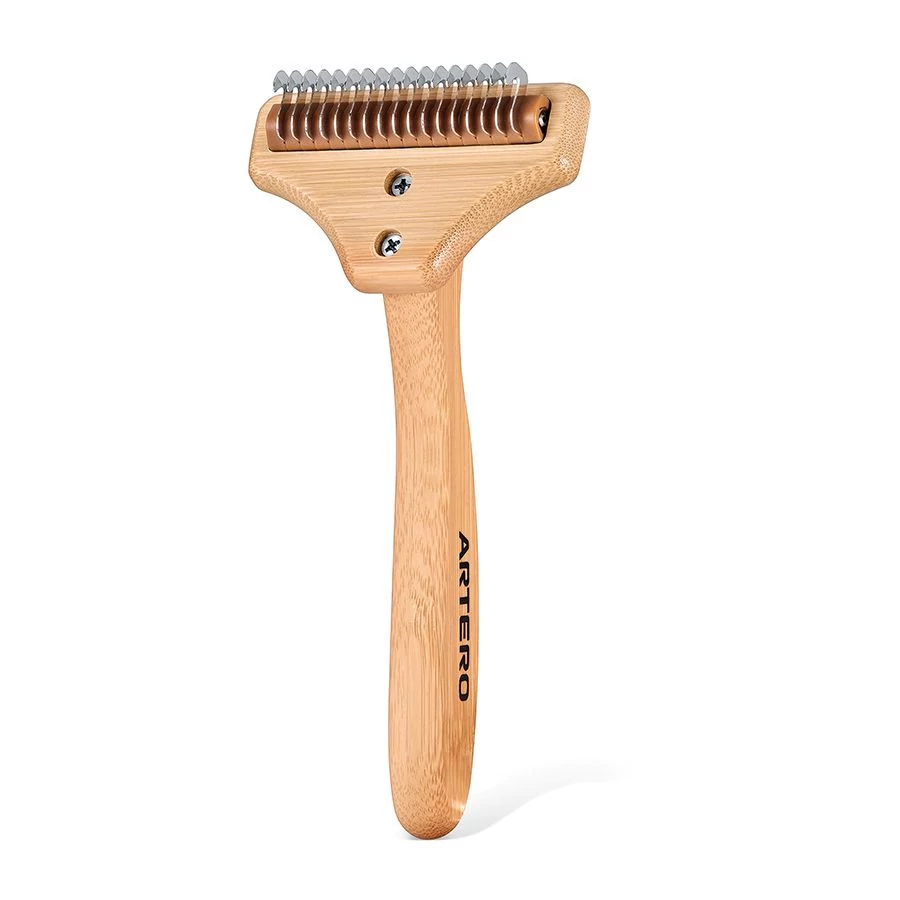Az ARTERO LEO aljszőr kiszedő hatékony megoldást kínál a vedlési időszak kezelésére, segít eltávolítani az elhalt szőrzetet, miközben kíméletes marad kedvenced bőréhez. Ergonomikus kialakításának köszönhetően könnyen használható, és látványos eredményt biztosít már néhány használat után is. A csúszásmentes, gumibevonatú bambusz nyél stabil és kényelmes fogást nyújt, így a szőrápolás biztonságosan és kontrolláltan végezhető. A 17 darab, speciálisan kialakított penge hatékonyan távolítja el a sűrű aljszőrzetet, felgyorsítva a vedlési folyamatot. A lekerekített pengevégek és a belső oldalon elhelyezett vágóélek biztosítják, hogy az eszköz ne érintkezzen közvetlenül a bőrrel, így minimalizálva az irritáció vagy sérülés kockázatát.